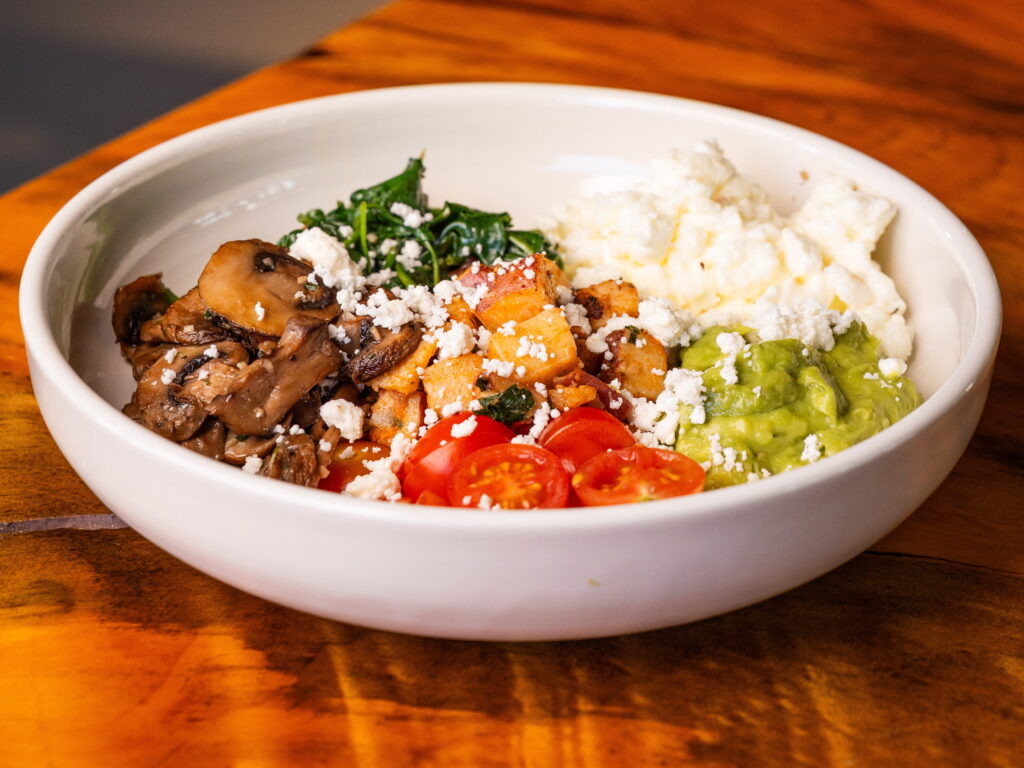The Think Tank Bowl ($17) is the signature morning anchor: red potato hash, egg whites, caramelized onion, roasted mushroom, spinach, cherry tomatoes, avocado, and feta. It reads like a list of ingredients that all need each other. The roasted mushroom pulls earthy and deep against the bright acid of the tomatoes, the feta brings sharp salt, and the avocado does what avocado does when it’s ripe — it rounds everything out without taking over.